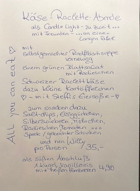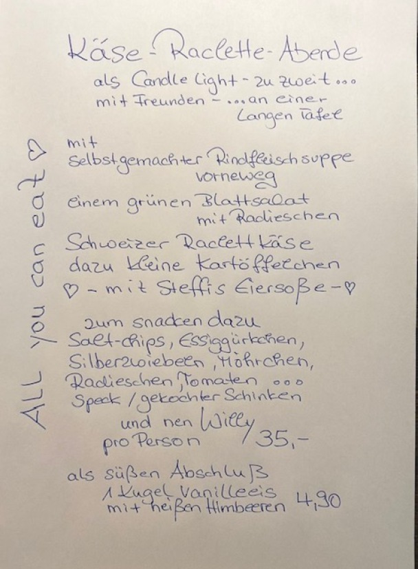 Raclette Abende als Candle Light... zu zweit ....mit Freunden....an einer langen Tafel den Abend genießen und sich bei Kerzenschein in der Kleinen Auszeit verwöhnen lassen.